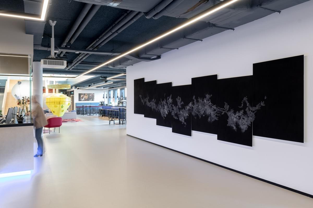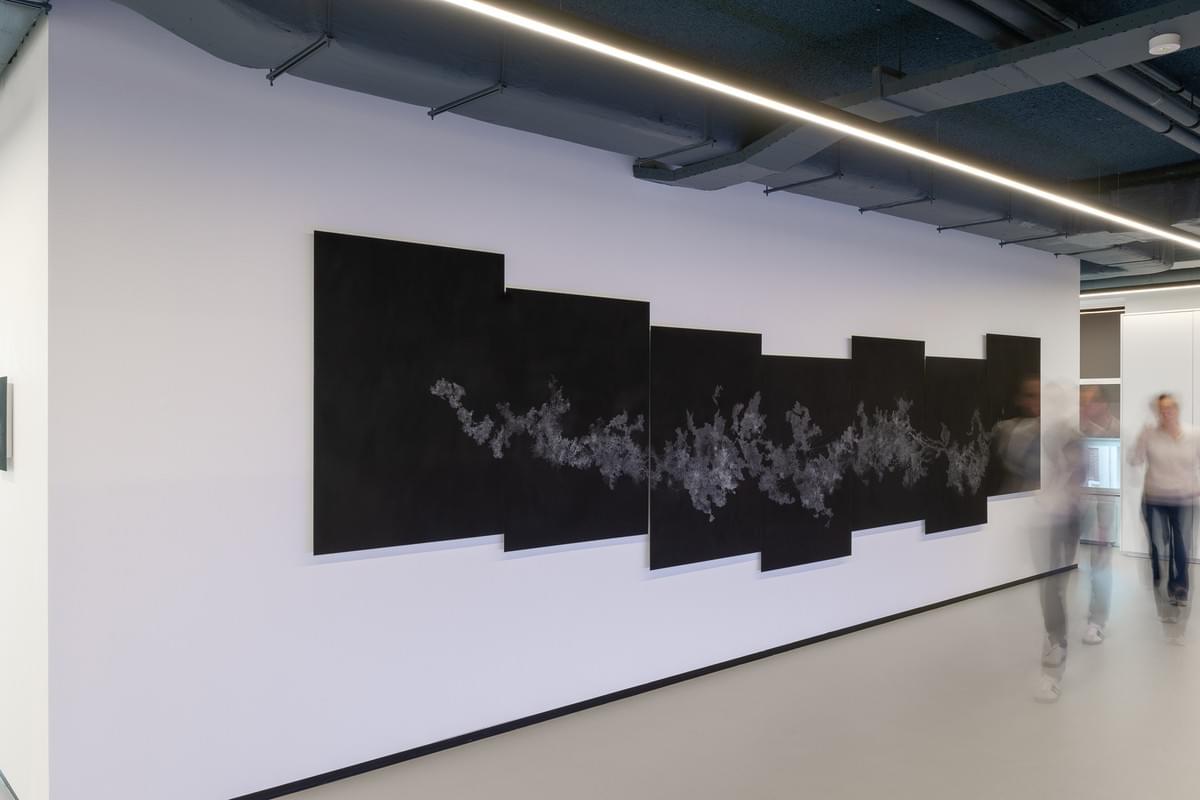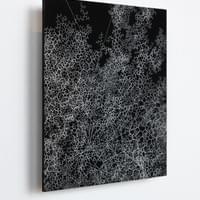 For the exhibition Sleep! at Kunsthal KAdE, Harm van den Berg created a large drawing installation: an elongated network drawn on panels with a total length of seven meters. For this work, he used a special technique called sgraffito, in which he meticulously removes black paint from the surface with a fine needle, revealing a delicate white web.